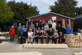 Zurzeit lagern alle vorbereiteten Teile im Traktorzelt, bis die Zimmerei den Skelettbau errichtet hat. Die Montage der Außenwände erfolgt später an einem Wochenende durch Studierende und NABU-Mitglieder. Dann sehen wir einige oder alle Studierenden wieder – darauf freuen wir uns.